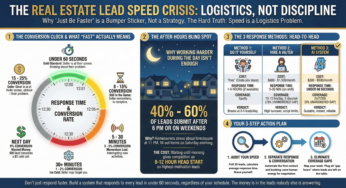 For most investors, the answer is uncomfortable. Forty to sixty percent of leads come in during off-hours. If you're relying on a VA who works 9-to-5, those leads are sitting untouched for 12-15 hours minimum.