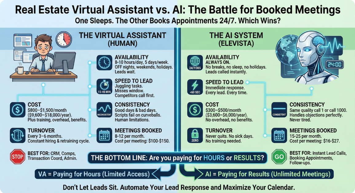 The real estate virtual assistant vs AI debate isn't about which technology is cooler. It's about which one actually puts meetings on your calendar consistently, 24 hours a day, without you babysitting it.